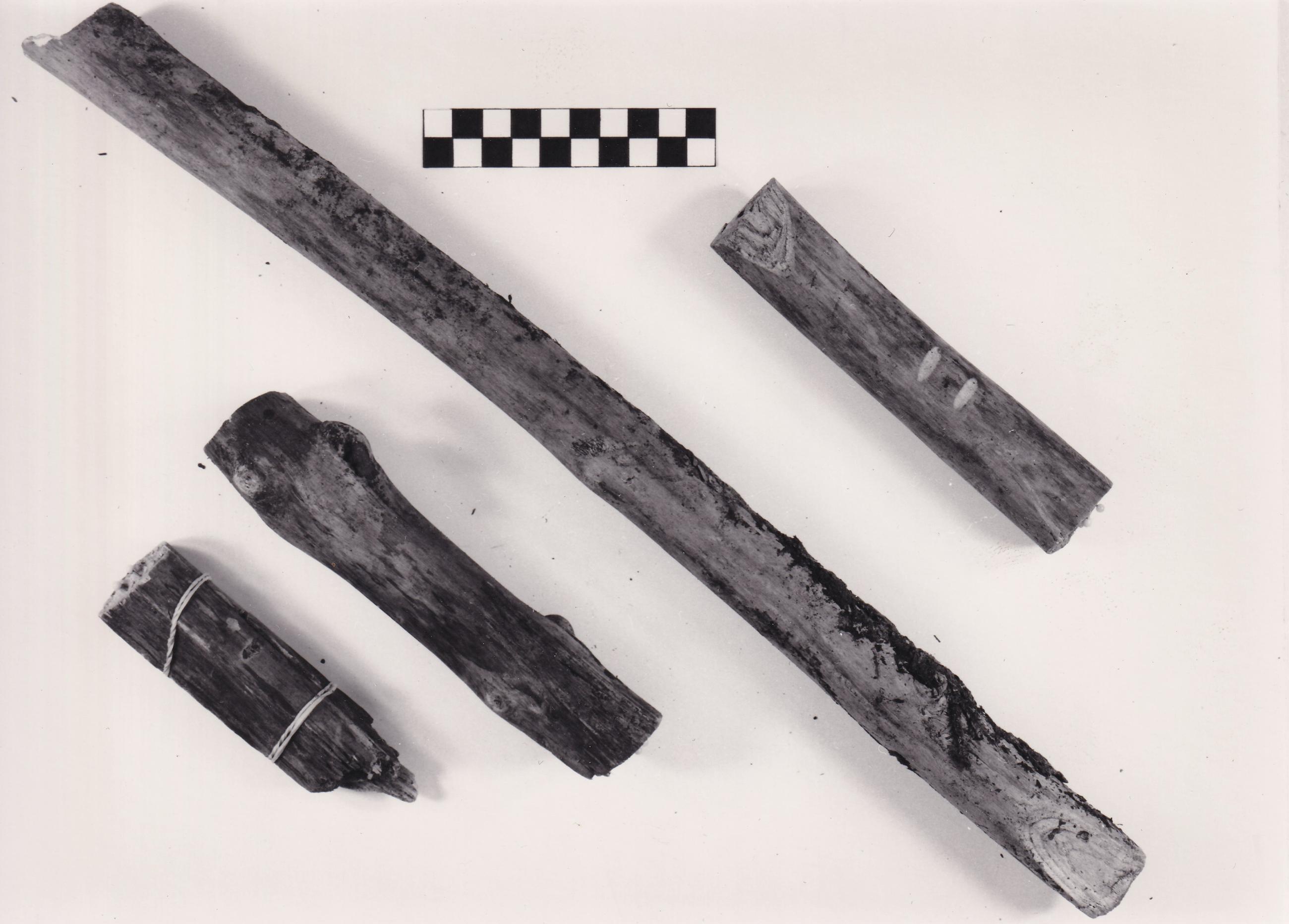 Fotodokumentation der BDA Restaurierungswerkstätten: vier Fragmente eines Pfählchens mit Bearbeitungsspuren; Siehe auch ID: BDAMMIX2_2