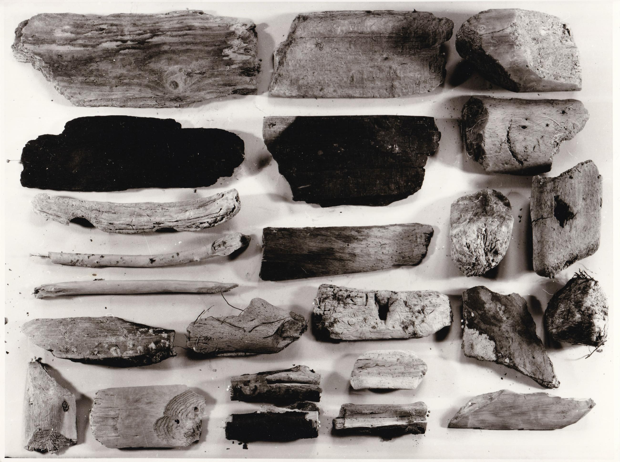 Fotodokumentation der BDA Restaurierungswerkstätten: Gesamtaufnahme verschiedener Holzfragmente; Teilweise mit Brandspuren