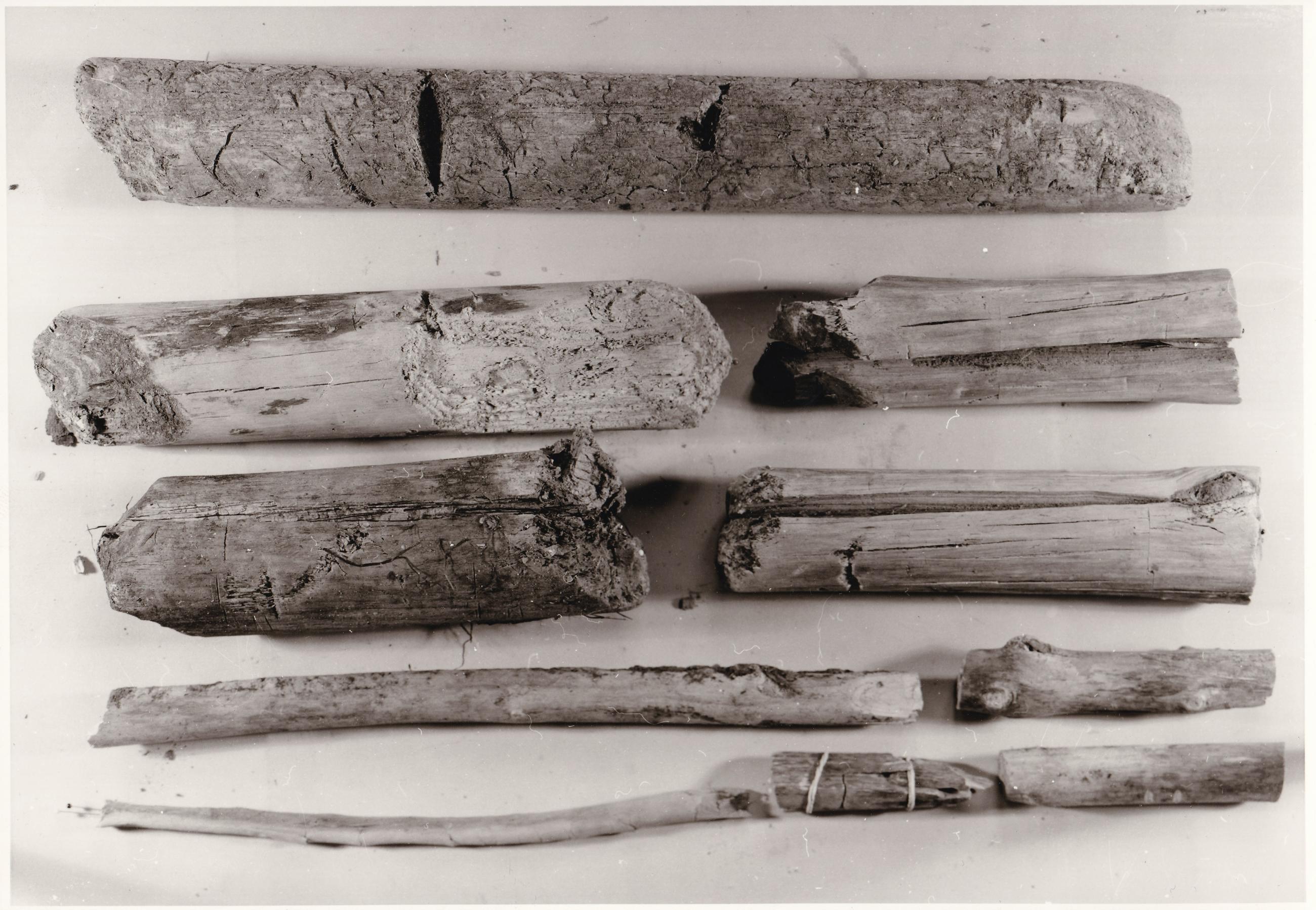 Fotodokumentation der BDA Restaurierungswerkstätten: Gesamtaufnahme verschiedener Holzfragmente; Teilweise mit Bearbeitungsspuren