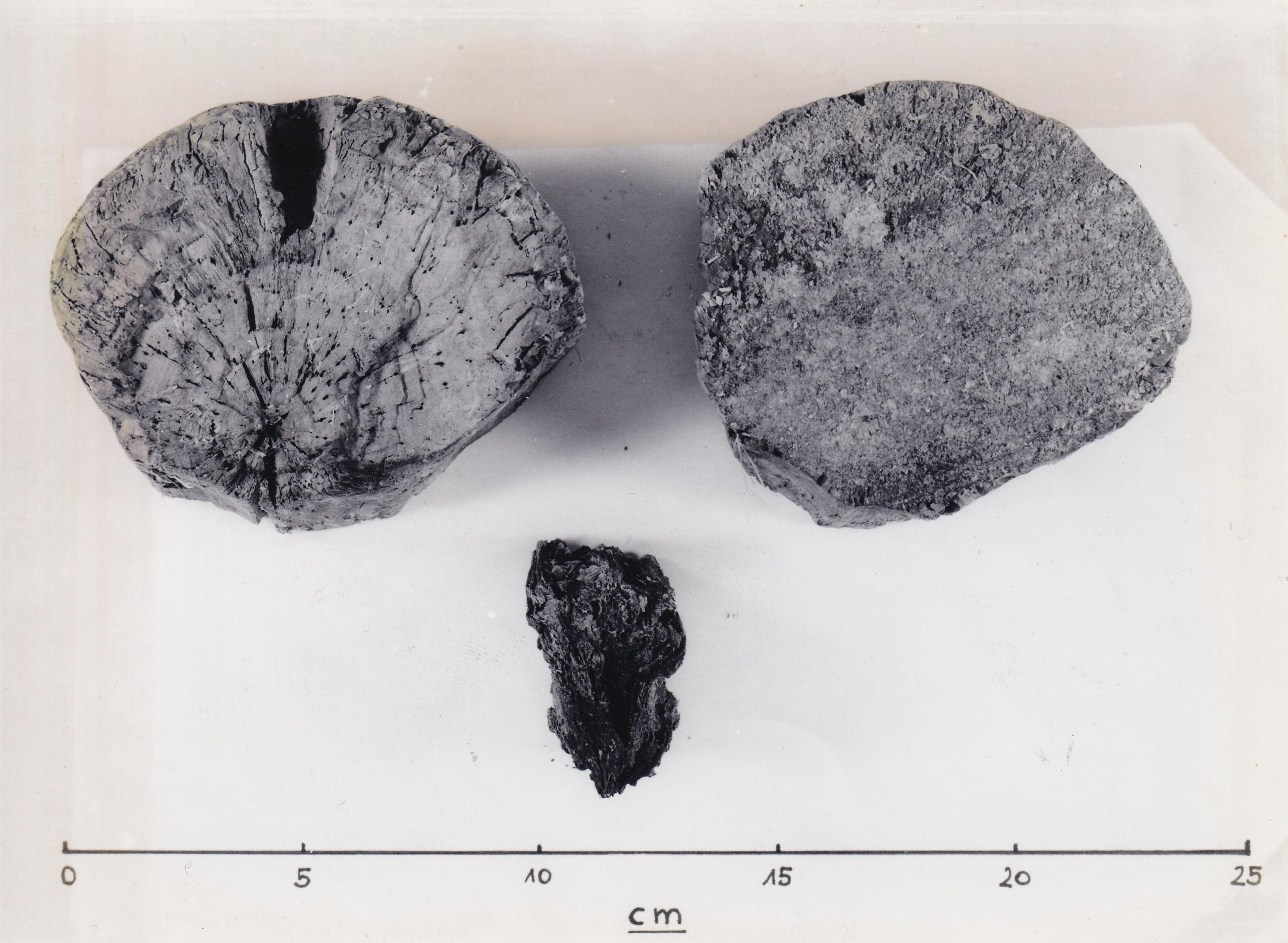 Fotodokumentation der BDA Restaurierungswerkstätten: Konservierungsversuche von Pfahlproben. Beschriftung: 2 (oben) gefriergetrocknet nach PEG 400 (15%)-Bad, 1 (unten) luftgetrocknet
