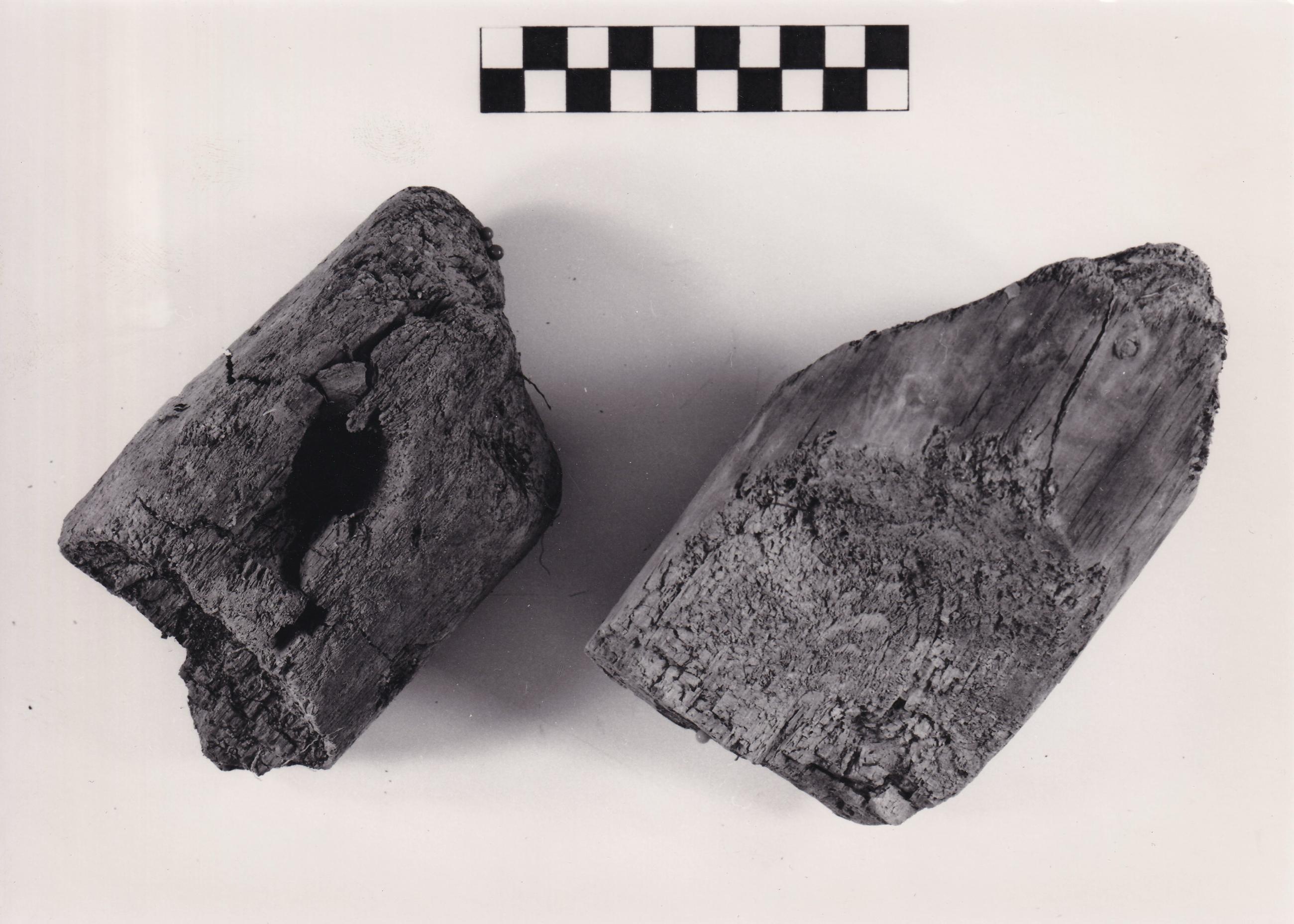 Fotodokumentation der BDA Restaurierungswerkstätten: zwei Pfahlproben im trockenen Zustand; Beschriftung: 1984, Q: 10/K, Q: 11/U-3; Siehe auch ID: BDAMQ10t2