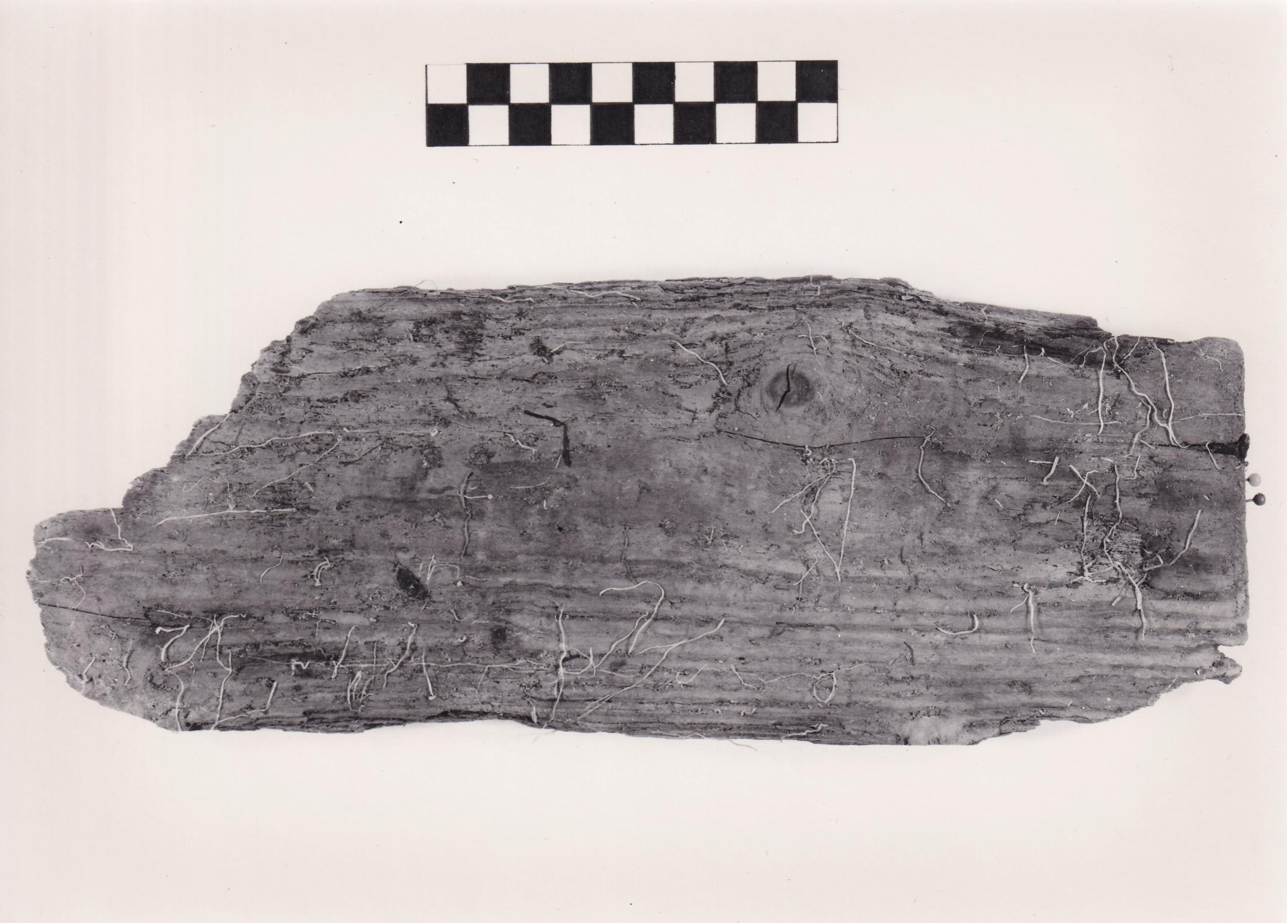 Fotodokumentation der BDA Restaurierungswerkstätten: Pfahlfragment im trockenen Zustand; Beschriftung: Q:20/Y. Siehe auch ID: BDAMQ20t3