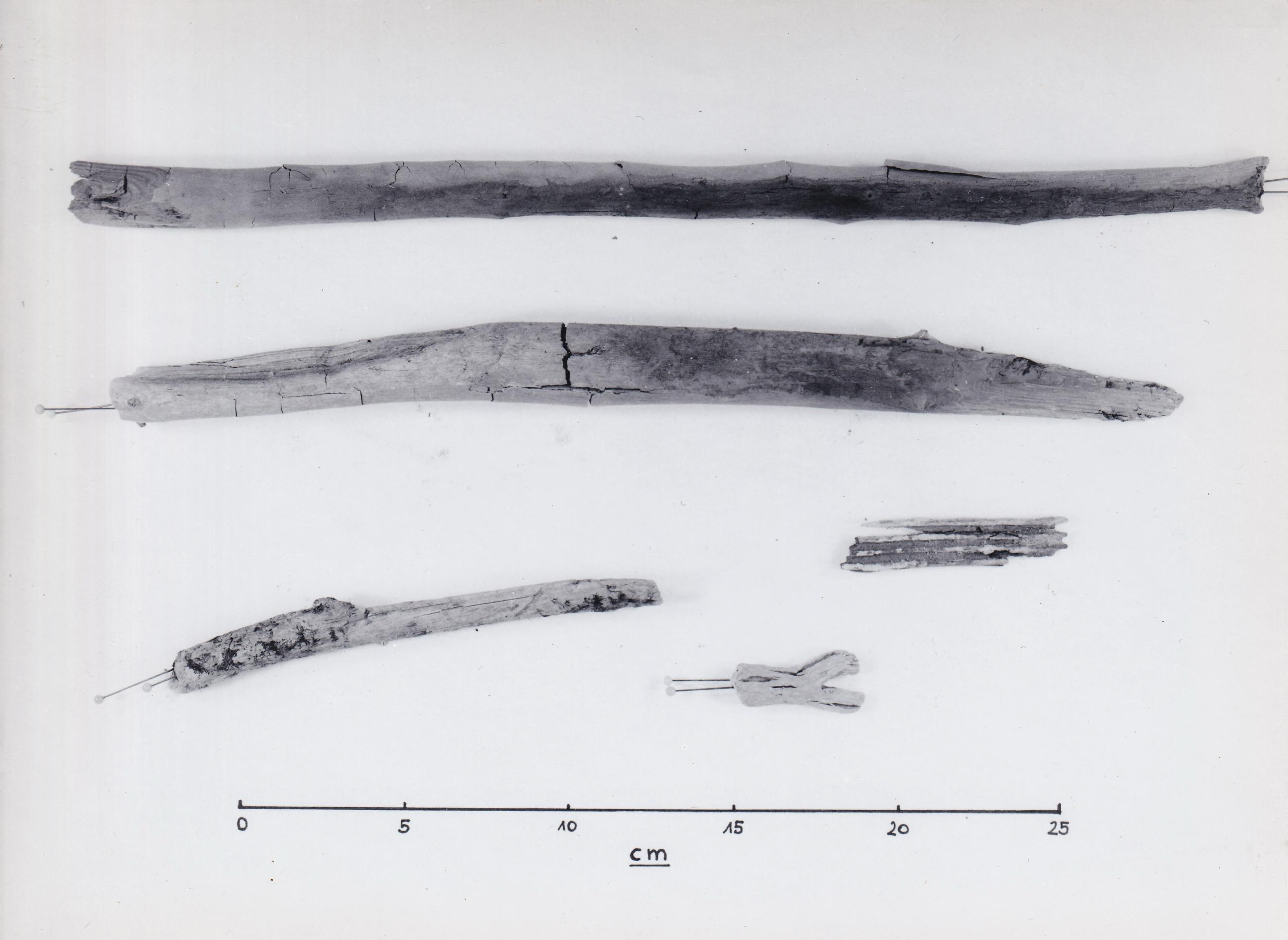 Fotodokumentation der BDA Restaurierungswerkstätten: fünf Holzfragmente im nassen Zustand. Inv. Nr. S-5914, S-5921, S-6113, S-6116, S-6122. Siehe auch ID: BDAMS5914n1 und BDAMS5914t2