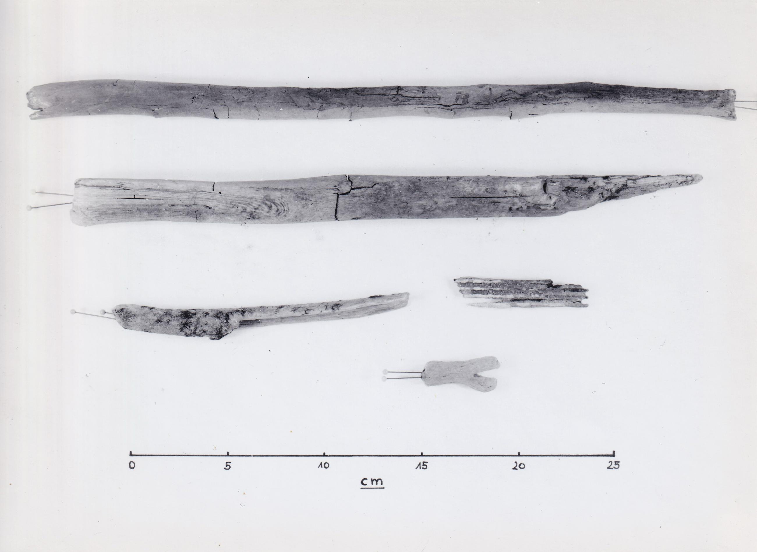 Fotodokumentation der BDA Restaurierungswerkstätten: fünf Holzfragmente im nassen Zustand. Inv. Nr. S-5914, S-5921, S-6113, S-6116, S-6122. Siehe auch ID: BDAMS5914n1 und BDAMS5914t1