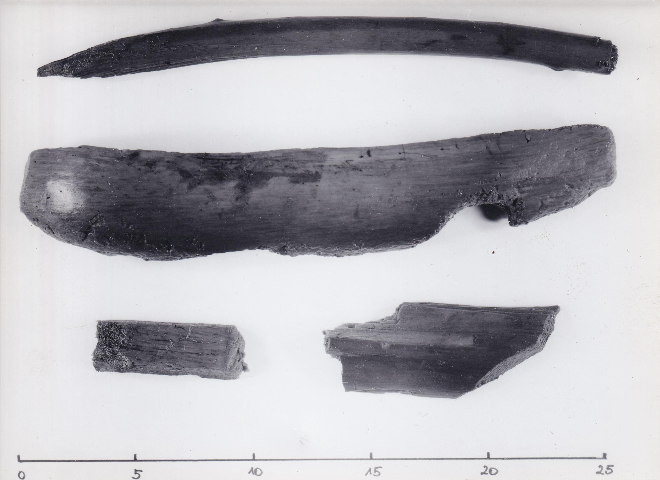 Fotodokumentation der BDA Restaurierungswerkstätten: vier Pfahlfragmente im nassen Zustand; Inv. Nr. S-5920, S-5923, S-6117. Siehe auch ID: BDAMS5920n1, BDAMS5920t1 und BDAMS5920t2
