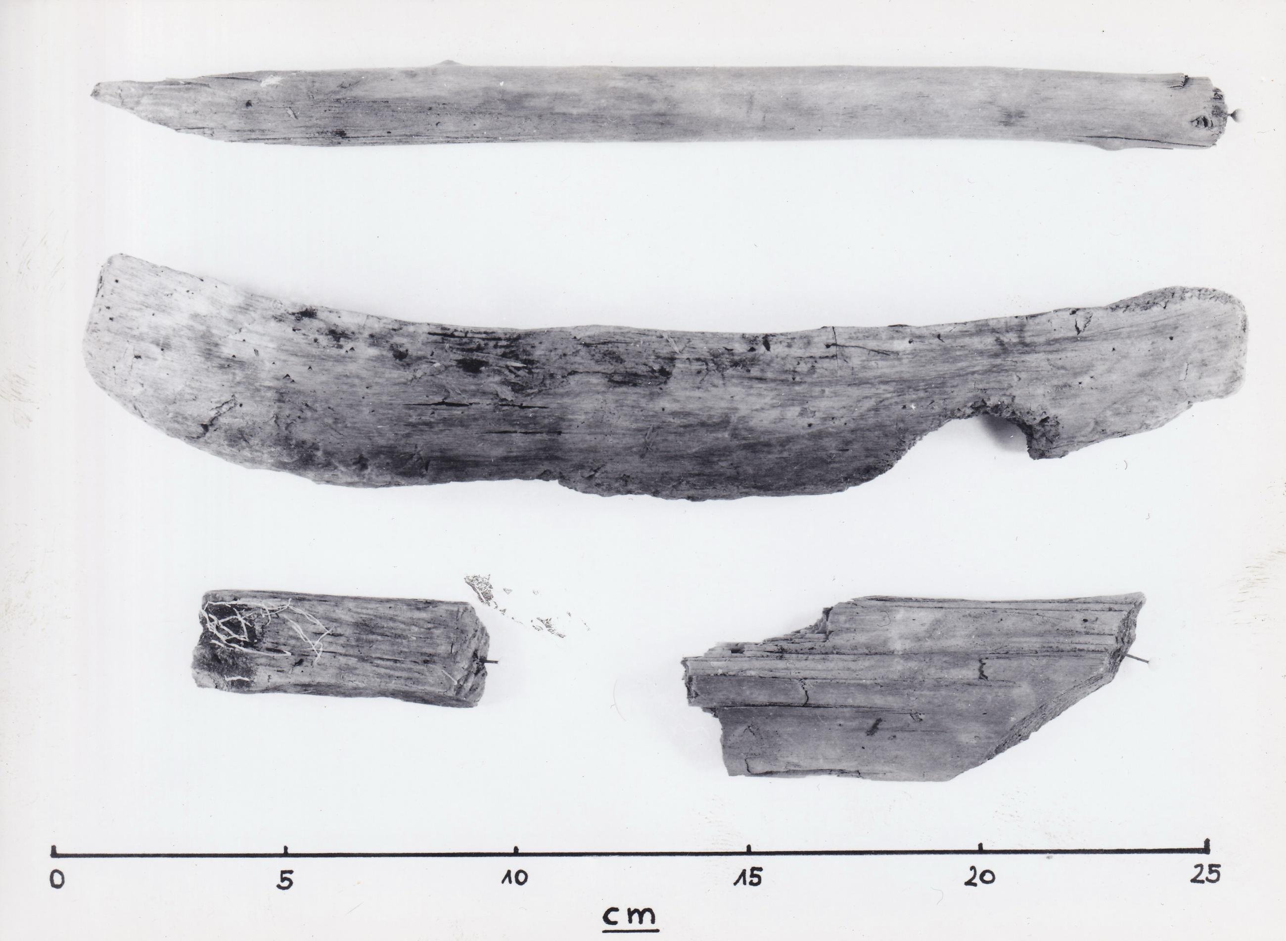 Fotodokumentation der BDA Restaurierungswerkstätten: vier Pfahlfragmente im trockenen Zustand; Inv. Nr. S-5920, S-5923, S-6117. Siehe auch ID: BDAMS5920n1, BDAMS5920n2 und BDAMS5920t1