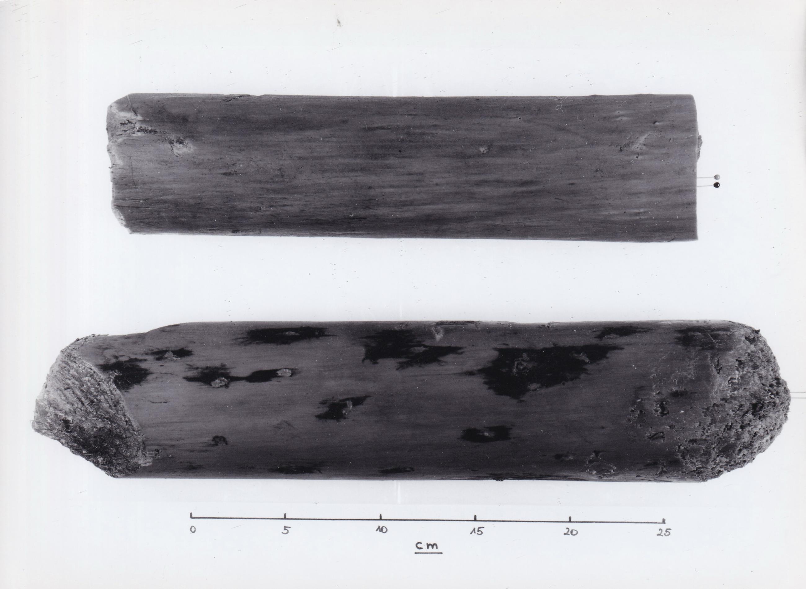 Fotodokumentation der BDA Restaurierungswerkstätten: zwei Pfahlfragmente im nassen Zustand; Inv. Nr. S-5928, S-6126. Siehe auch ID: BDAMS5928n1, BDAMS5928n2, BDAMS5928n3, BDAMS5928t1 und BDAMS5928t2