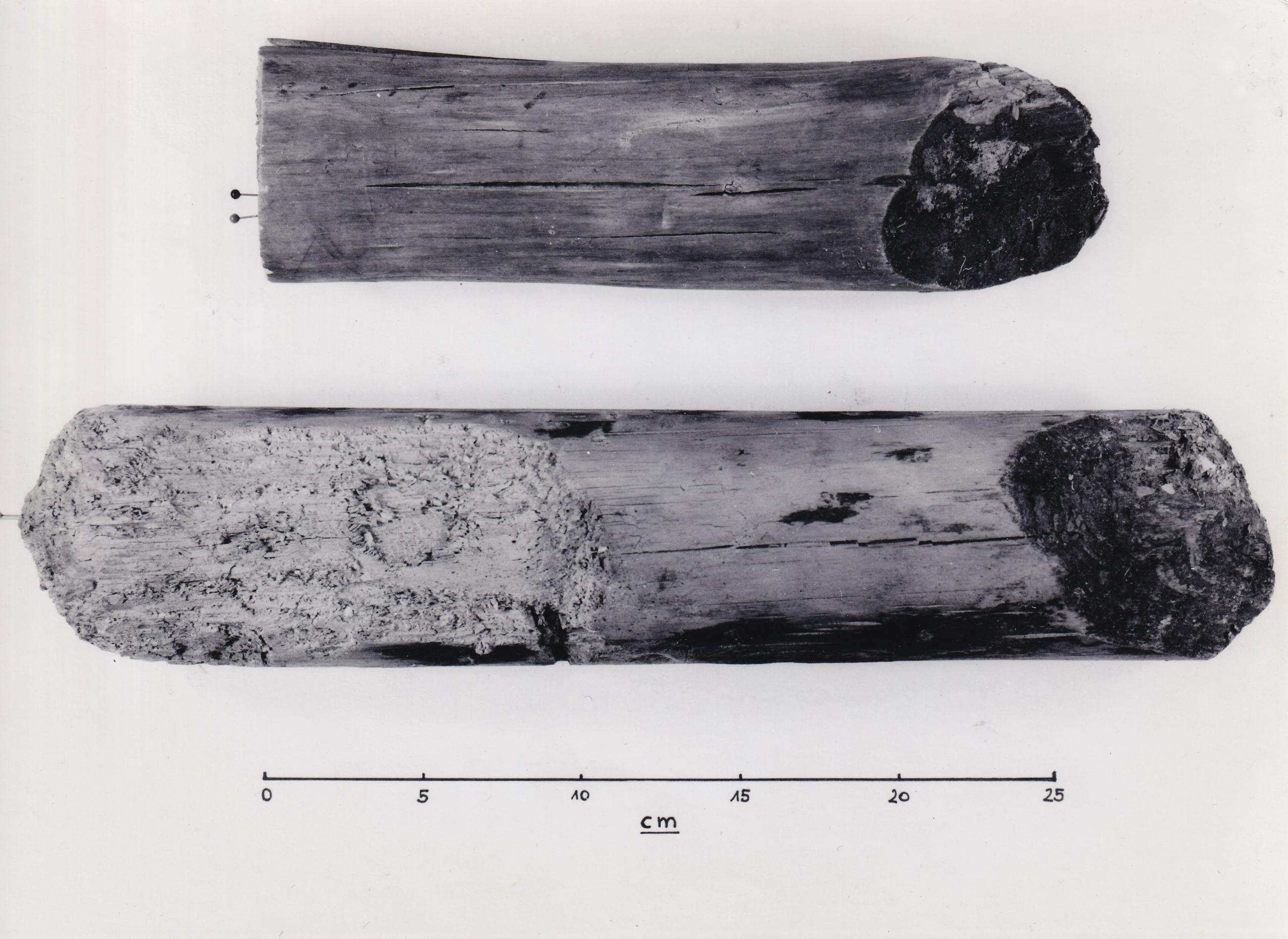 Fotodokumentation der BDA Restaurierungswerkstätten: zwei Pfahlfragmente im trockenen Zustand; Inv. Nr. S-5928, S-6126. Siehe auch ID: BDAMS5928n1, BDAMS5928n2, BDAMS5928n3, BDAMS5928n4 und BDAMS5928t1