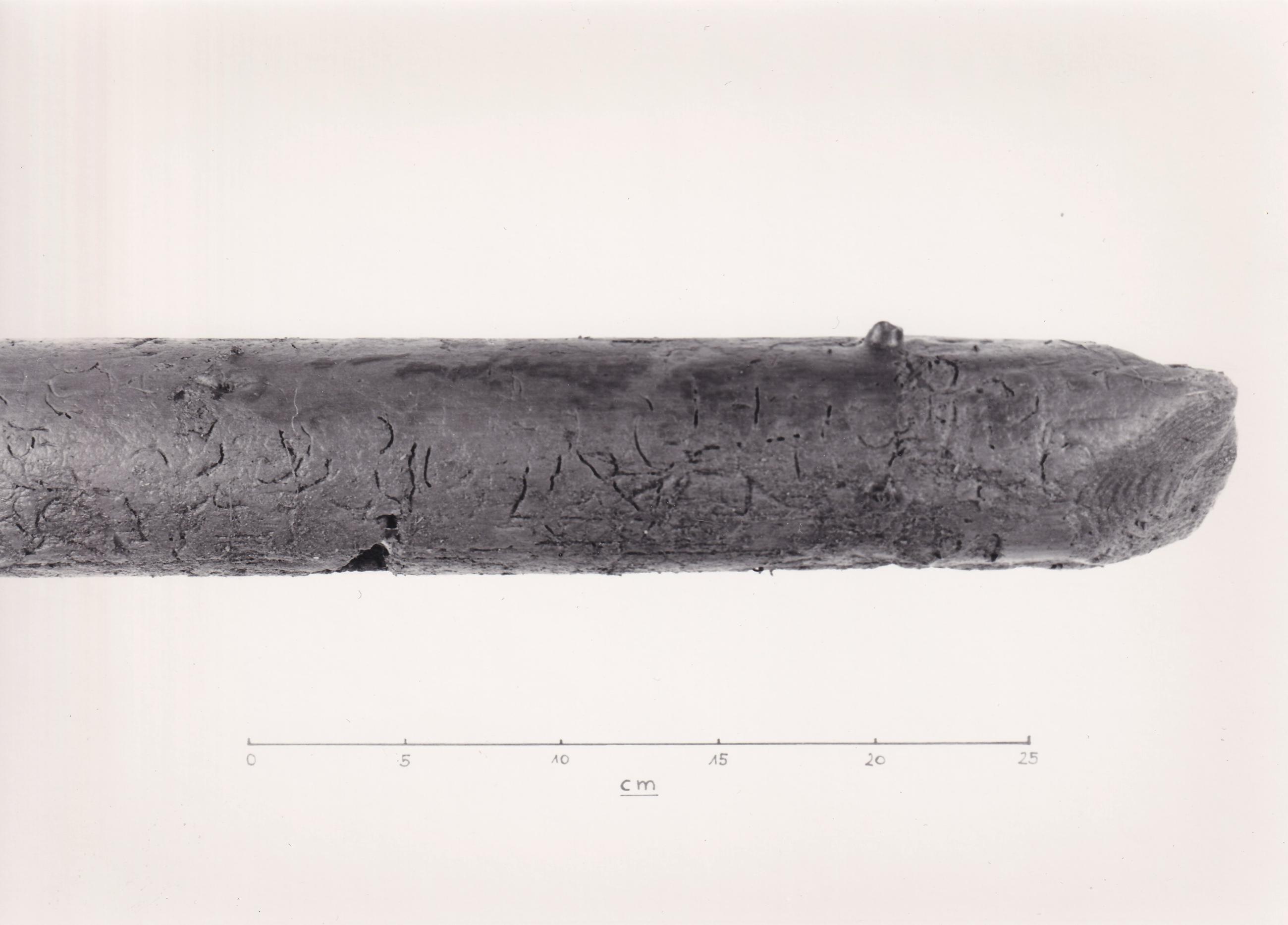 Fotodokumentation der BDA Restaurierungswerkstätten: Teilaufnahme eines kleinen Pfählchens im nassen Zustand; Inv. Nr. S-6108. Siehe auch ID: BDAMS6108n1, BDAMS6108n2, BDAMS6108n3, BDAMS6108n5, BDAMS6108n6