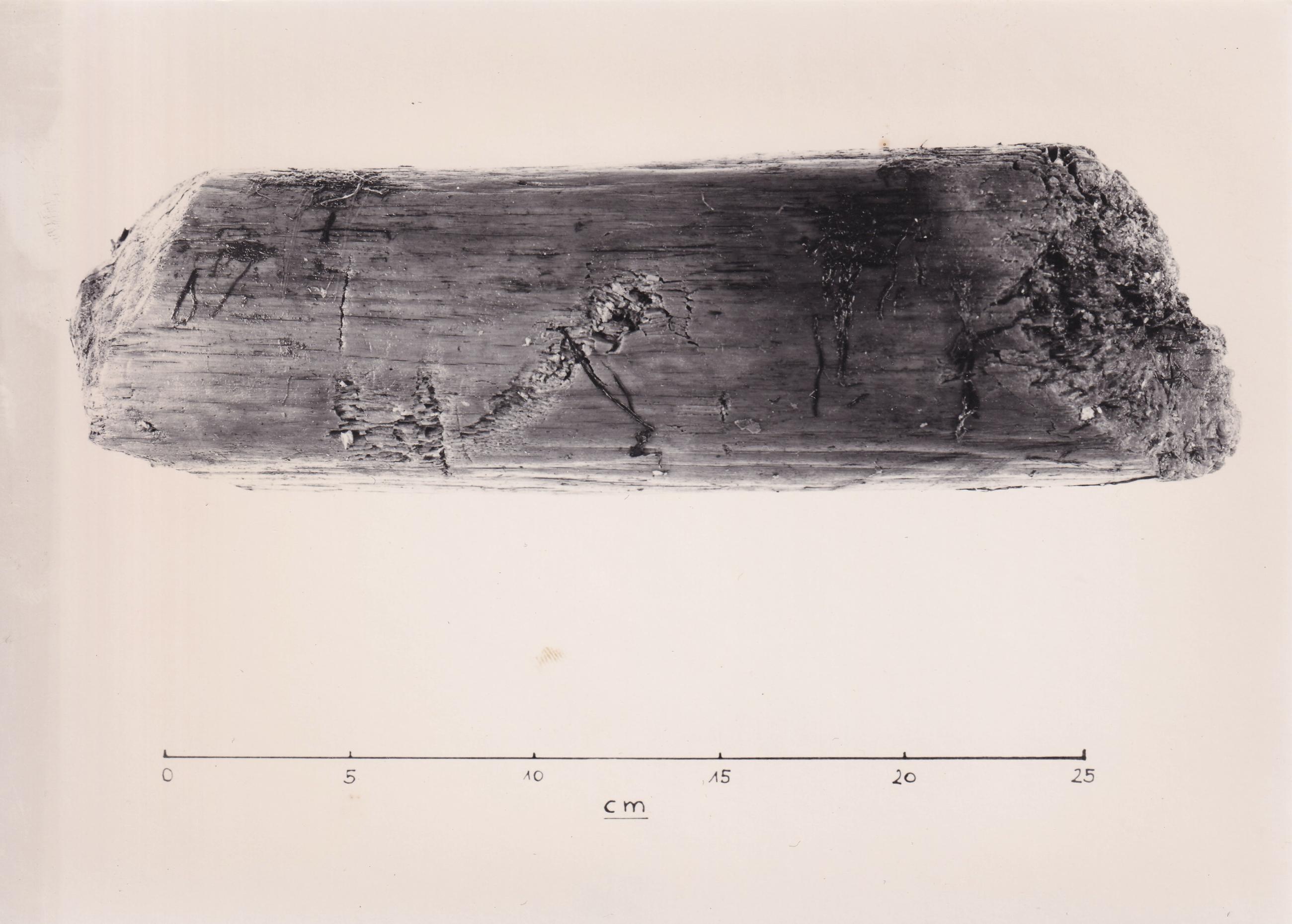 Fotodokumentation der BDA Restaurierungswerkstätten: Pfahlfragment im trockenen (?) Zustand; Inv. Nr. S-6110. Siehe auch ID: BDAMS6110_1, BDAMS6110_2, BDAMS6110_4