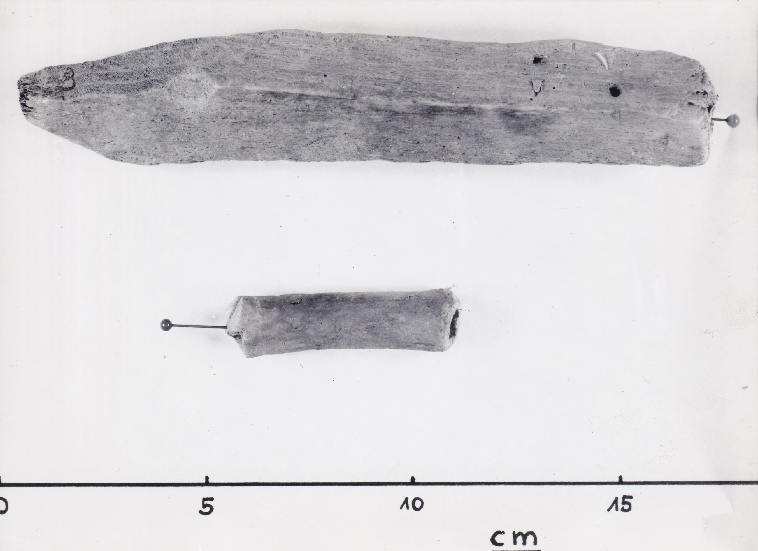 Fotodokumentation der BDA Restaurierungswerkstätten: zwei Pfahlfragmente im trockenen Zustand; Inv. Nr. S-6114, S-6123. Siehe auch ID: BDAMS6114n1, BDAMS6114n2, BDAMS6114t1