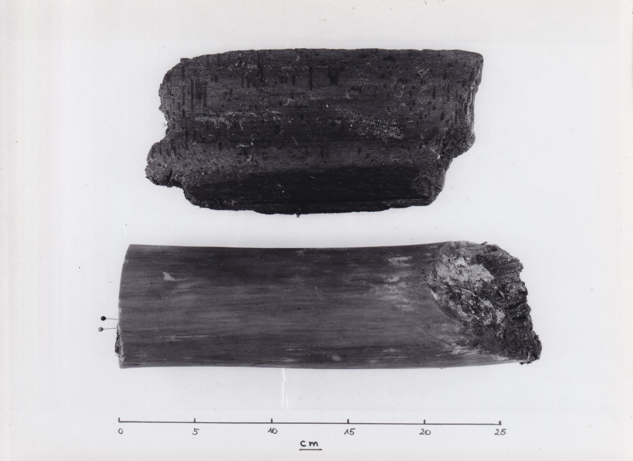 Fotodokumentation der BDA Restaurierungswerkstätten: zwei Pfahlfragmente im nassen Zustand; Inv. Nr. S-6119, S-6126. Siehe auch ID: BDAMS6119n1, BDAMS6119t1, BDAMS6119t2