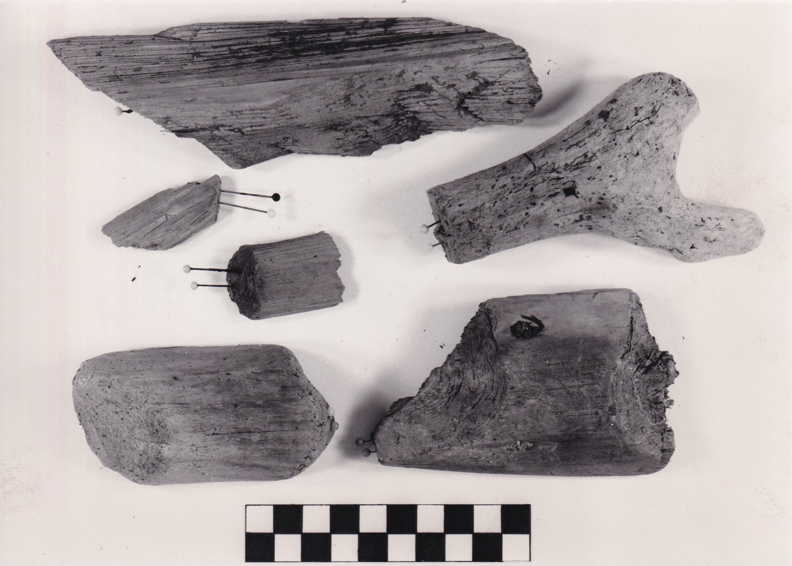 Fotodokumentation der BDA Restaurierungswerkstätten: sechs Holzfragmente; Beschriftung: 1984, Q12/F; Gra 8,5-9,5m; Inv. Nr. S-6122.