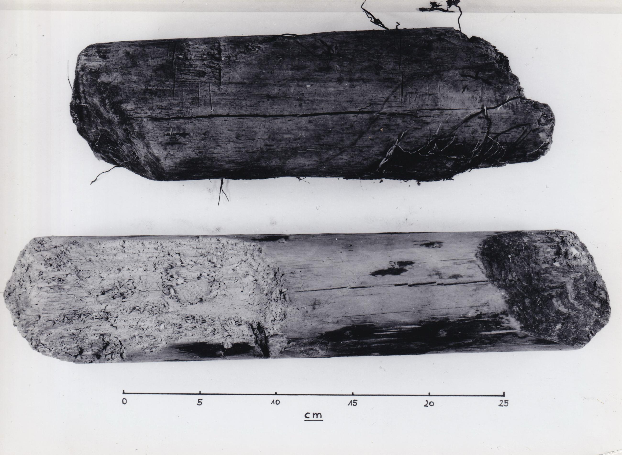 Fotodokumentation der BDA Restaurierungswerkstätten: zwei Pfahlfragmente im trockenen Zustand; Inv. Nr. S-6126, S-6110. Siehe auch ID: BDAMS6126n1, BDAMS6126n2, BDAMS6126t1, BDAMS6126t2, BDAMS6126t4