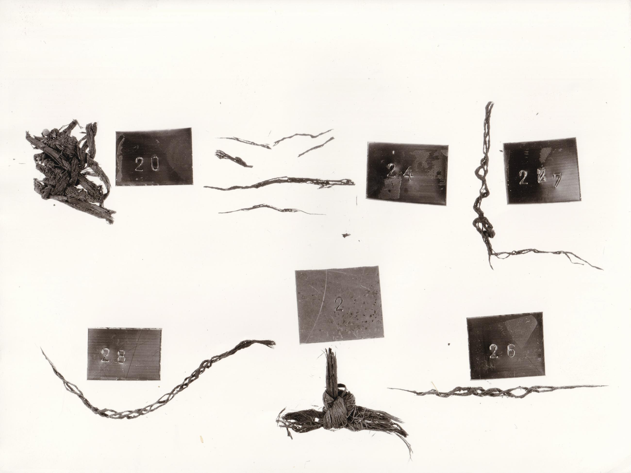 Fotodokumentation der BDA Restaurierungswerkstätten: Gesamtaufnahme von Textilresten; Kons.Nr.: 2 & 20 & 24 & 26-28