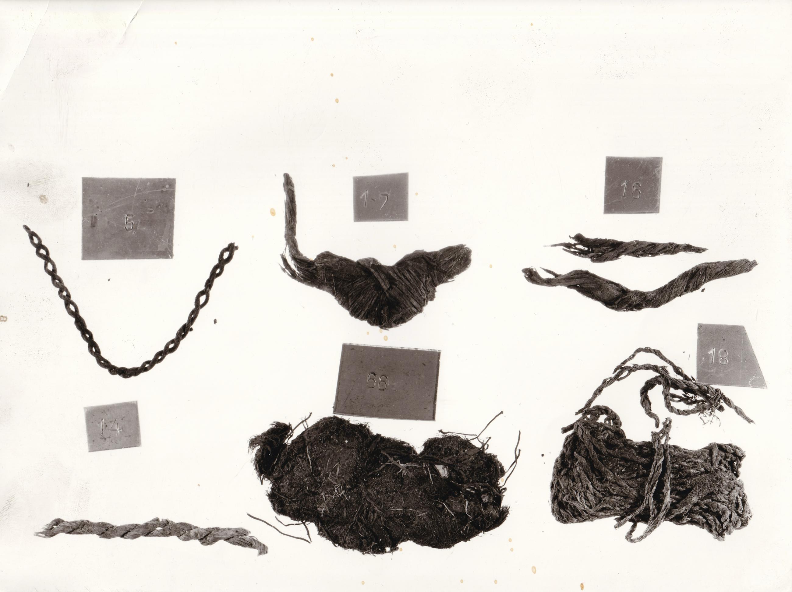 Fotodokumentation der BDA Restaurierungswerkstätten: Aufnahme von Textilresten; Kons.Nr.: 5 & 14 & 16-18 & 66