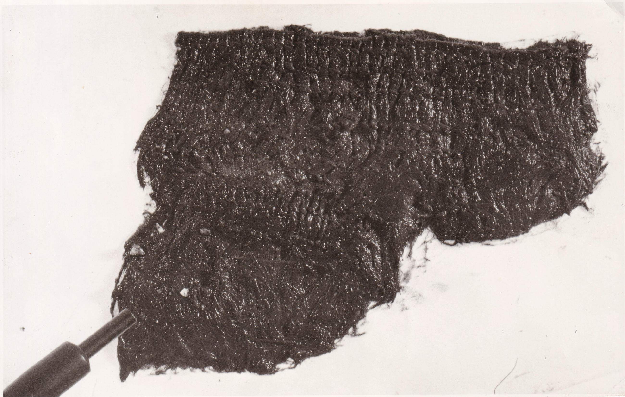 Fotodokumentation der BDA Restaurierungswerkstätten: Aufnahme von Taschenfragment(?); Beschriftung: vor der Feinreinigung in feuchtem Zustand auf Kunststoffträger aufgelegt; Kons.Nr.:53; siehe auch BDAMTK53_1, BDAMTK53_2