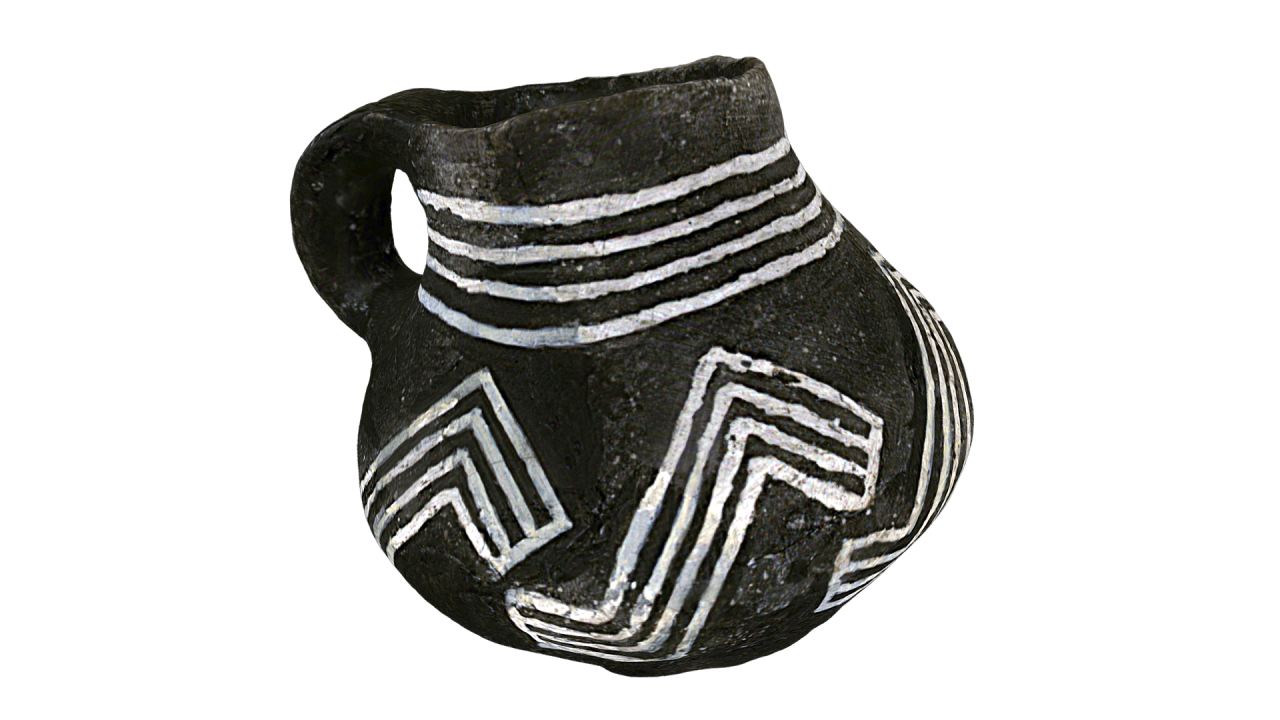 Komplett erhaltener Krug mit Winkelornamenten und Inkrustation