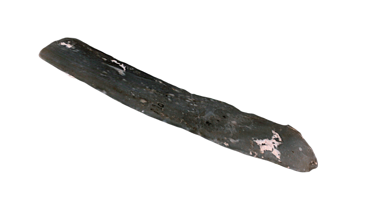 Doppelschneidige Silexklinge; Inv. Nr. nicht lesbar. Beschriftung: Mondsee; eventuell vom Monte Lessini / IT